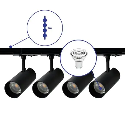 Komplettset 1-Phasen Rail 1 Meter Schwarz | incl. 4x Spot + GU10 2700K 3W Dimmbar + Abschlusskappe, Stromanschluss