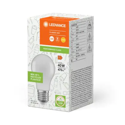 Cette ampoule Ledvance Classic LED E27 Poire Dépolie 4.9W 470lm - 827 | Remplacement 40W - Recyclé est l’alternative idéale pour la remplacement de votre ampoule classique de 40 W. La technologie LED intégrée vous offrira de nombreux avantages. Les ampoules à incandescence traditionnelles ont une durée de vie limitée. Cette alternative LED vous permettra de profiter d’un éclairage durable et fiable.