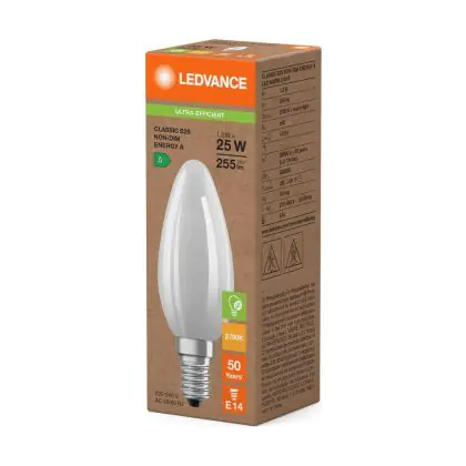 Cette ampoule Ledvance LED Classic E14 Bougie Filament Dépolie 1.2W 255lm - 827 | Remplacement 25W avec son efficacité lumineuse de lumen par watt vous permettra de profiter d’un éclairage de qualité. Avec sa durée de vie de 50000 heures, vous n’aurez pas à vous soucier de son remplacement avant quelques années.